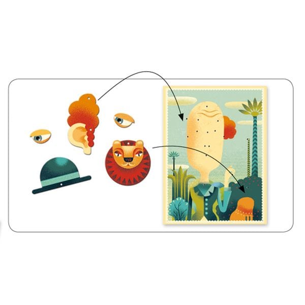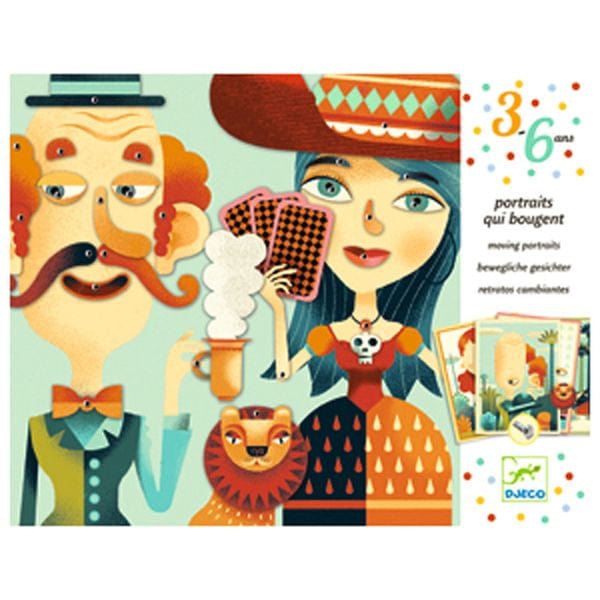 Avec Djeco Portraits qui bougent, les enfants deviennent de vrais petits artistes! Ce coffret créatif propose de composer des portraits amusants en fixant différents éléments (yeux, chapeaux, accessoires rigolos) grâce à de petites attaches parisiennes. Chaque tableau prend vie et devient mobile: les yeux roulent, les bras bougent, les chapeaux s’agitent… éclats de rire garantis!