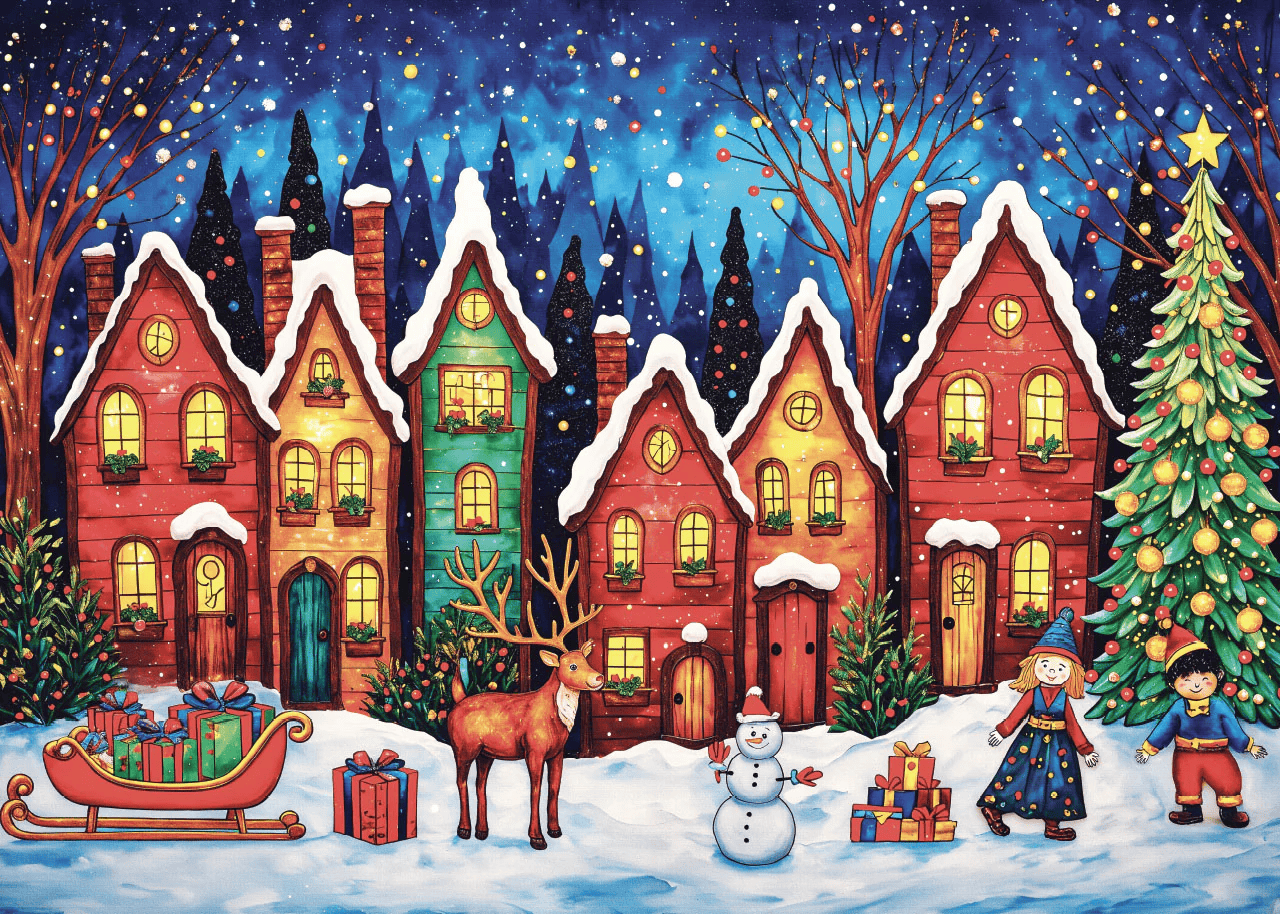 Sous un ciel d’hiver étincelant, une charmante rue de village s’illumine à la veille de Noël. Les maisons colorées, coiffées de neige, brillent de mille feux tandis qu’un renne majestueux, un bonhomme de neige souriant et un sapin décoré complètent cette scène festive. Les enfants s’amusent dans la neige, entourés de cadeaux et de lumières dorées, capturant toute la chaleur et la joie des Fêtes.