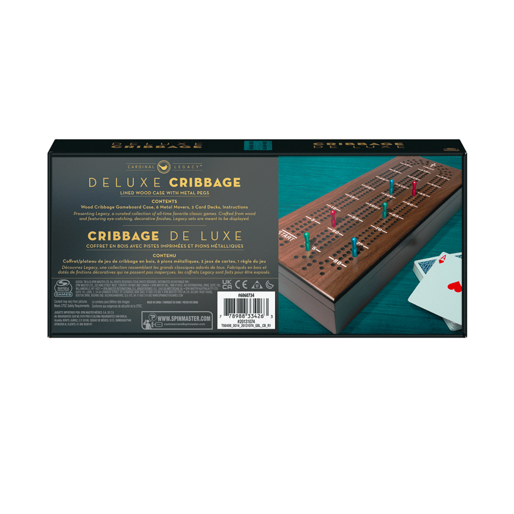 Jeu de Cribble de luxe avec coffret en bois avec doublure et pions métalliques colorés.