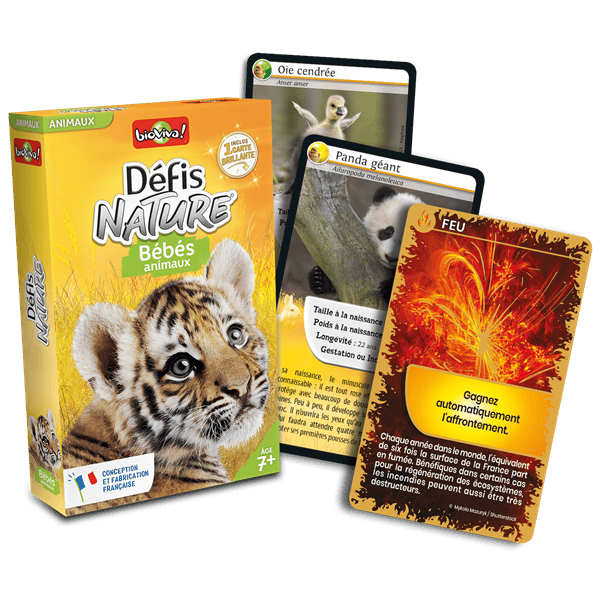 Défis Nature Bébés animaux t’invite à partir à la rencontre des bébés animaux les plus adorables de la planète. Chaque carte met en lumière une espèce différente avec ses caractéristiques distinctives. Le principe est simple : choisis la caractéristique la plus forte de ton animal, compare-la à celle des autres joueurs et tente de remporter toutes les cartes en jeu.