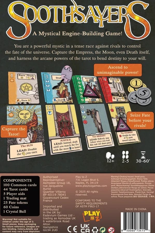 Soothsayers est conçu par Jeff Grisenthwaite et publié par Play to Z. Les illustrations proviennent des œuvres iconiques de Pamela Colman Smith, donnant au jeu une identité visuelle forte et immédiatement reconnaissable.