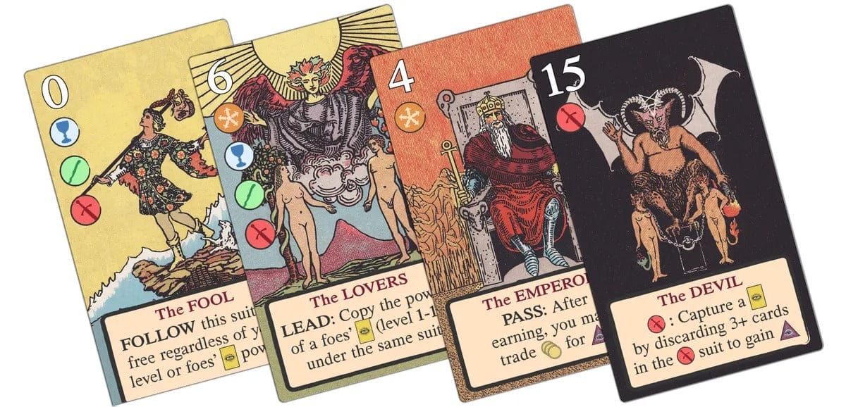 Fait intéressant: le jeu utilise l’intégralité des 22 arcanes majeurs du Tarot, inspirés du célèbre Rider-Waite illustré par Pamela Colman Smith en 1909, aujourd’hui dans le domaine public. Une variante avancée permet même d’intégrer le paquet «Transcended Tarot» pour ajouter davantage d’interaction et de complexité après une première partie.