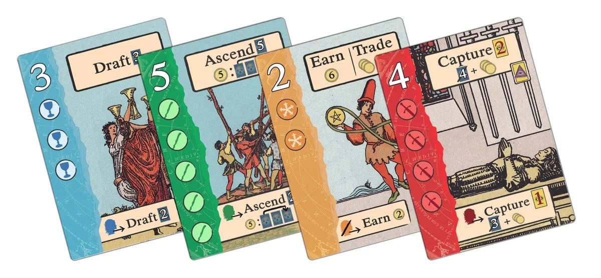 Chaque tour, tu «mènes» une des quatre actions de ton tableau: Gagner des pièces (Earn), Échanger (Trade), Recruter (Draft), Élever ton niveau (Ascend) ou Capturer une carte Tarot (Capture). Les autres joueurs peuvent suivre ton action… mais s’ils ont un niveau inférieur au tien, ils doivent te payer pour le privilège. Cette mécanique de suivi crée une tension constante et une économie interactive brillante.