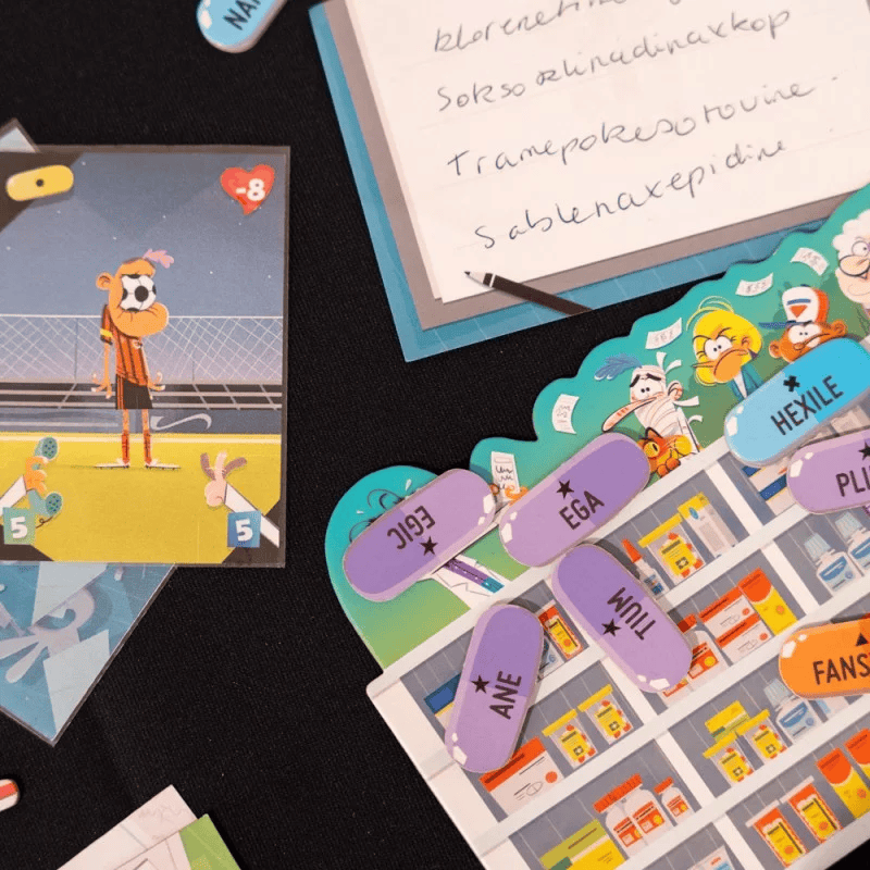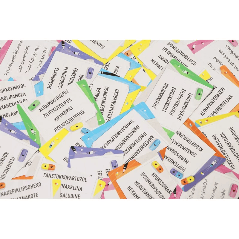 Dr Gribouille (FR) transforme une séance de pharmacie en véritable chaos hilarant. Le principe est simple mais totalement déjanté. À chaque tour, un joueur devient le docteur et doit écrire en seulement 25 secondes une ordonnance composée de 4 médicaments, tirés d'une carte Traitement. Derrière son paravent, il écrit vite et mal, ce qui plongera les autres joueurs dans une mission périlleuse de déchiffrage. Les pharmaciens disposent ensuite de 2 minutes pour tenter de reconstituer les noms des médicaments à l'aide des jetons Pilule sur le plateau. Chaque mot correctement identifié augmente la santé du patient et vous rapproche de la guérison collective.