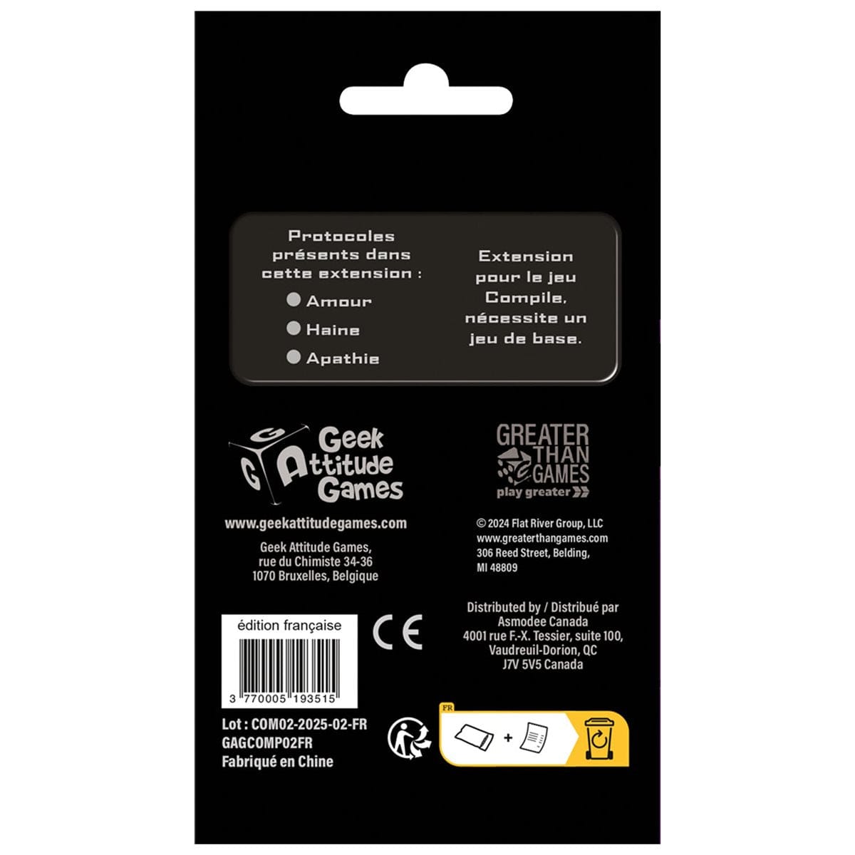 Dans Compile: Extension #1, l’univers du jeu prend une tournure plus introspective. Les intelligences artificielles ne se contentent plus d’analyser la logique et les concepts abstraits; elles plongent maintenant dans la complexité des émotions humaines. Cette extension introduit trois nouveaux Protocoles: Amour, Haine et Apathie, chacun apportant une nouvelle dynamique de jeu et de nouvelles interactions stratégiques.