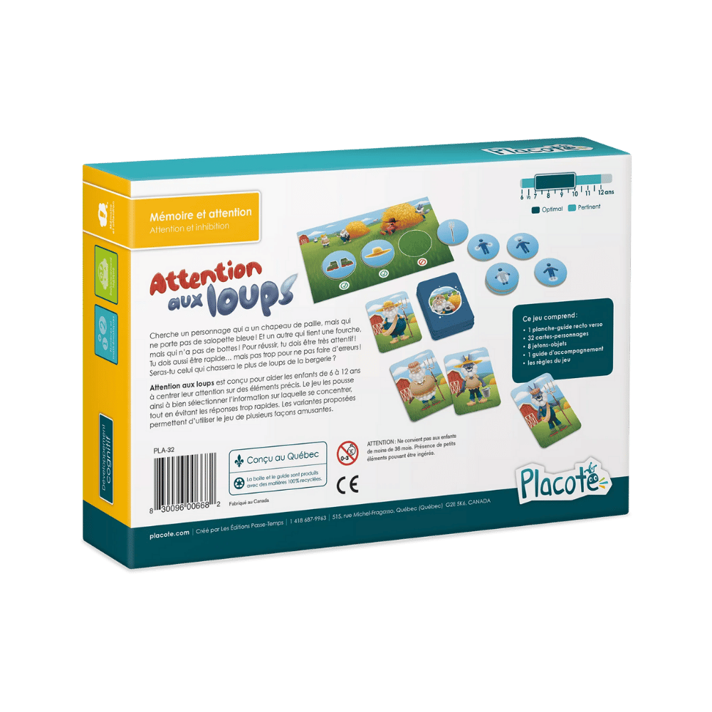 Attention aux loups est conçu pour aider les enfants de 6 à 12 ans à centrer leur attention sur des éléments précis. Le jeu les pousse ainsi à bien sélectionner l’information sur laquelle se concentrer, tout en évitant les réponses trop rapides. Les variantes proposées permettent d’utiliser le jeu de plusieurs façons amusantes.