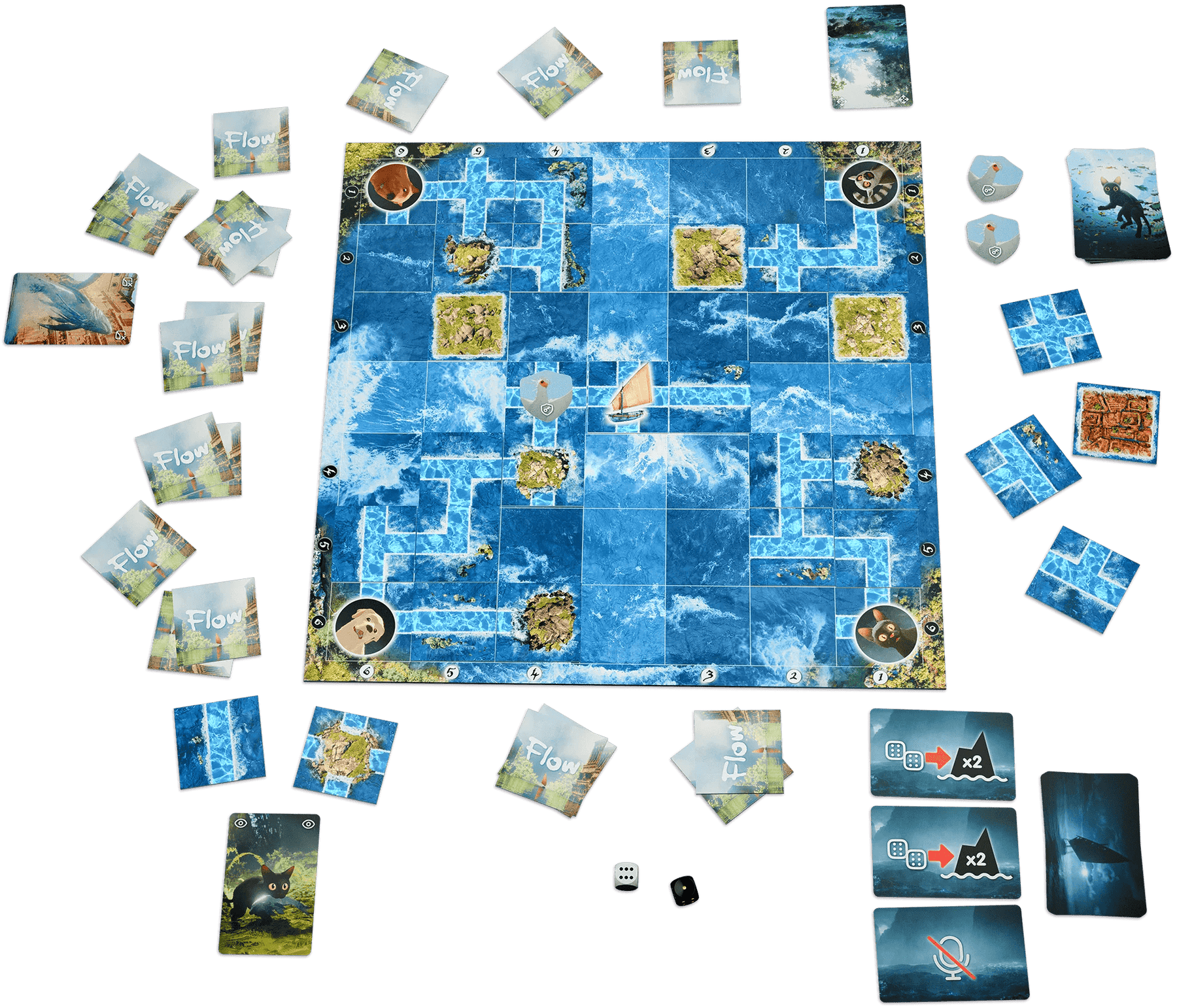 Flow est un jeu coopératif nerveux et immersif inspiré du film d’animation à succès du même nom. Les joueurs incarnent une équipe tentant de sauver un chat et ses compagnons, coincés dans une mer déchaînée, en les aidant à rejoindre un bateau avant qu’ils ne soient à court de force. Tout se joue en temps réel, sans tours structurés, ce qui crée une tension constante et une forte interaction entre les joueurs.