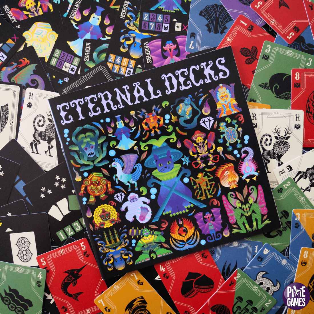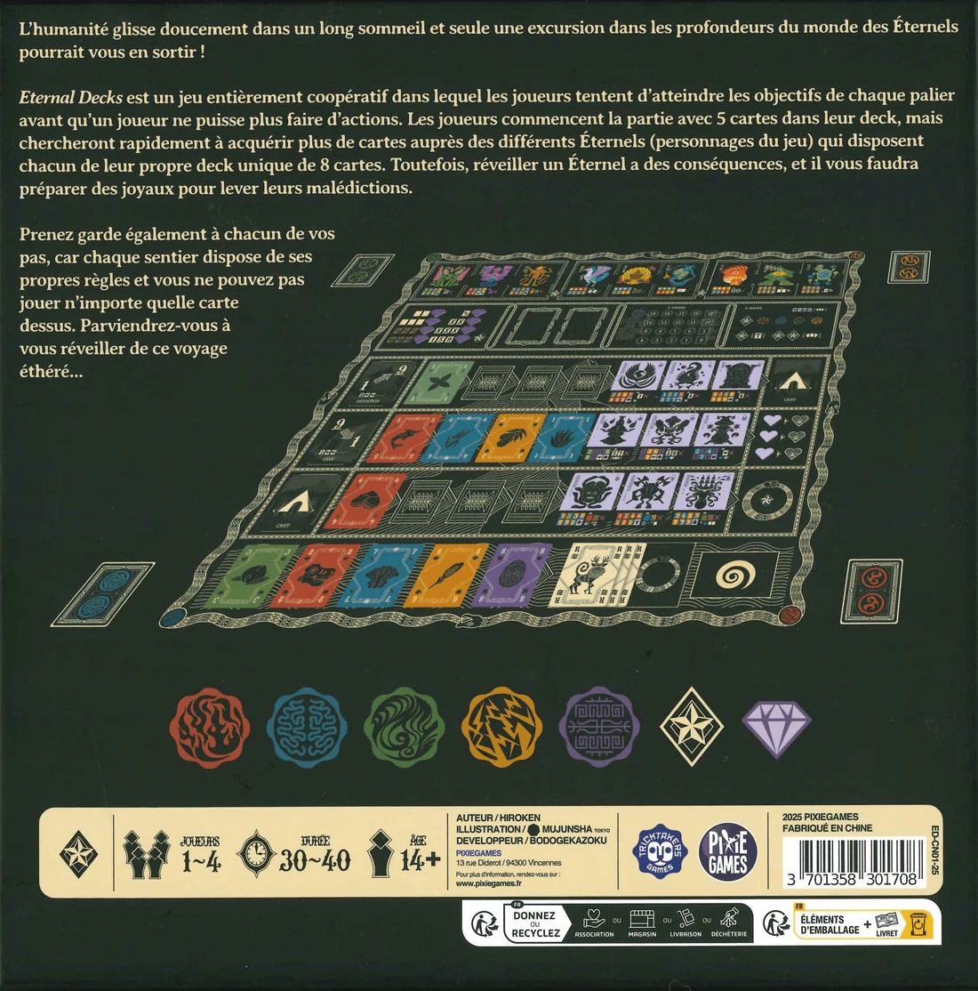 L’humanité sombre doucement dans un profond sommeil… Dans Eternal Decks, vous et vos alliés êtes les derniers espoirs. Ensemble, plongez dans le monde mystérieux des Éternels et tentez d’accomplir des objectifs toujours plus difficiles à travers six paliers uniques : collecter des points, survivre dans un village fantôme, résoudre des énigmes de labyrinthe, affronter un gardien colossal, relever une épreuve de silence et, enfin, assister au réveil du dragon.