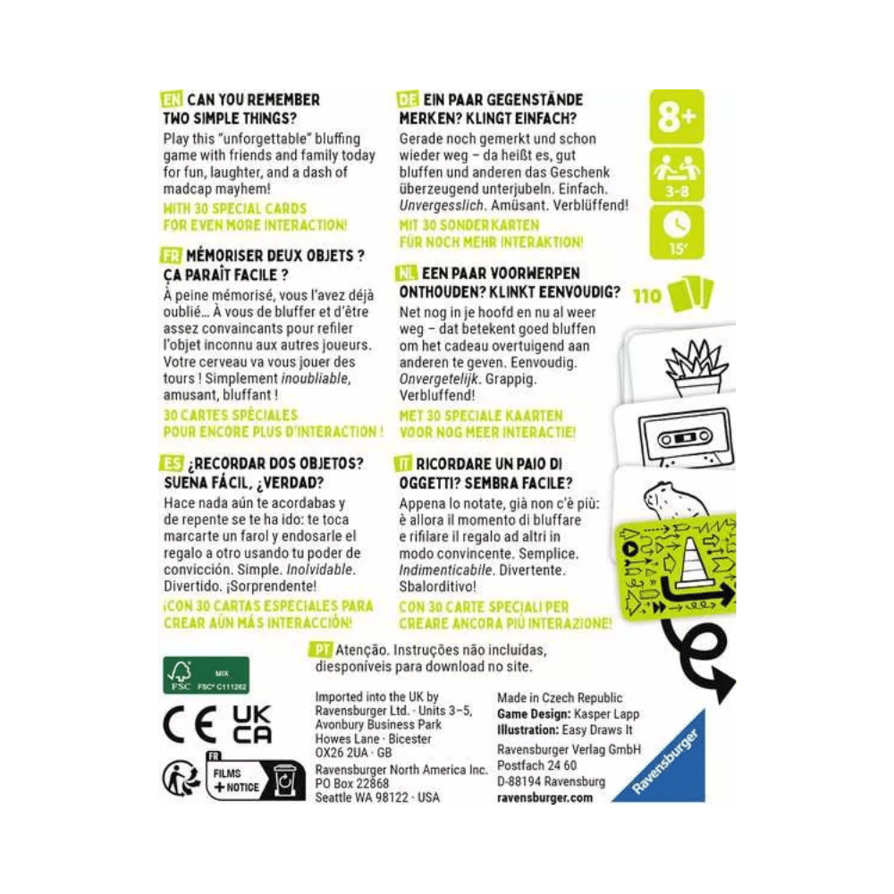 “Unforgettable” fun with this family card game. Players must give gifts to each other while remembering who gave what gift and which gift they have in front of them. Can’t remember? Time to get bluffing to avoid a penalty point!