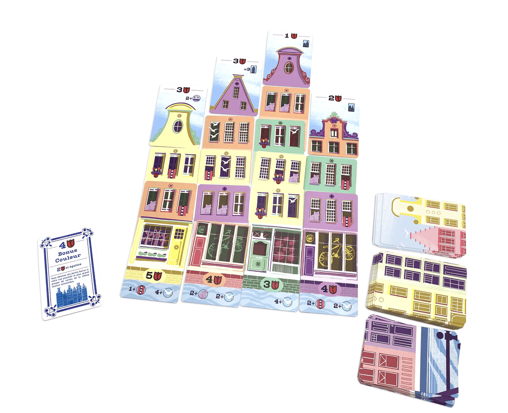 In Bellevue, players become architects along Amsterdam’s famous canals, competing to build the most beautiful row of Flemish-style houses. Each house must start with a base, rise through several floors, and be capped with a roof, creating a colourful and iconic skyline.