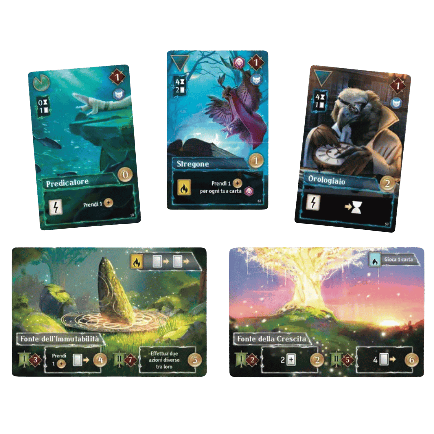 The heart of the game lies in its sliding time-tile system, determining when your cards become active. Every decision matters: accelerating key cards, optimizing your hand, conquering sources or setting up powerful combos. With over one hundred cards and numerous interactions, Echoes of Time delivers a rich experience perfect for fans of strategy board games and engine building.