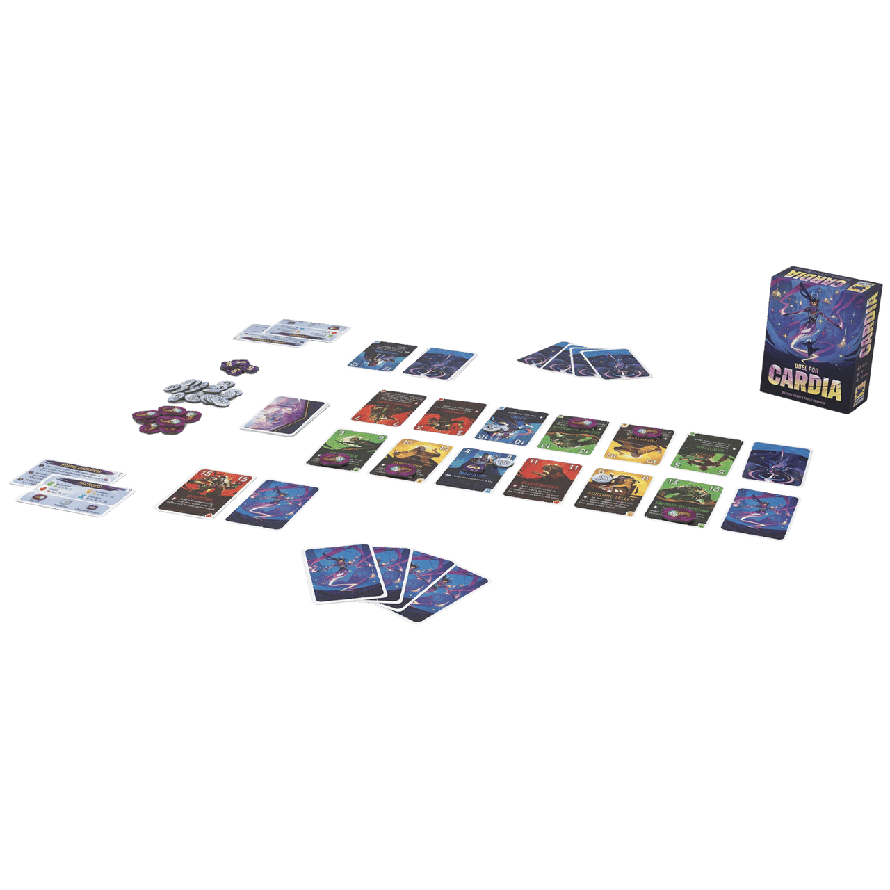 In Duel for Cardia, two players face off with identical 16-card decks, each card bearing its own influence value and unique ability. Each encounter is a simultaneous reveal : the higher card earns a signet, while the lower card triggers its ability, sometimes changing everything.