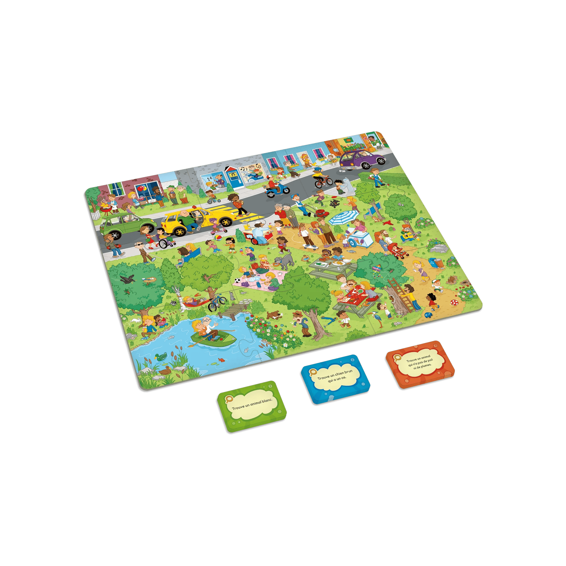 In Que le meilleur trouve!, children explore a large illustrated scene made of puzzle pieces and race to spot the item described on each instruction card. Prompts might say “Find a white animal!”, “Spot a blue object used for sitting!”, or “Find a yellow food that is not a fruit!”. Designed for children aged 3 to 7, the game encourages listening comprehension, categorization and visual scanning in a playful, interactive way. Three difficulty levels increase the complexity of the instructions, giving children room to grow while keeping the challenge fun and engaging.