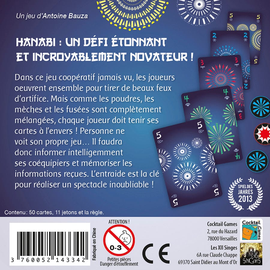 Hanabi est un défi étonnant et incroyablement novateur! Dans ce jeu coopératif, les joueurs œuvrent ensemble pour tirer de beaux feux d’artifice. Mais comme les poudres, les mèches et les fusées sont complètement mélangées, chaque joueur doit tenir ses cartes à l’envers! Coopérez et tirez le plus beau des feux d'artifice.